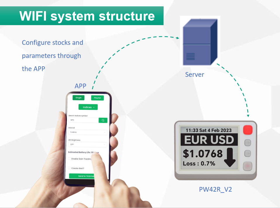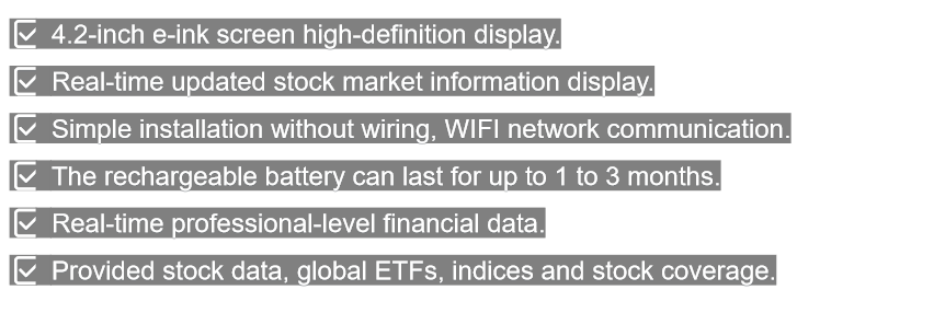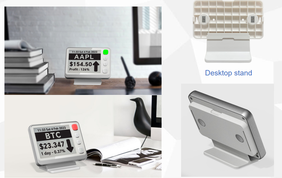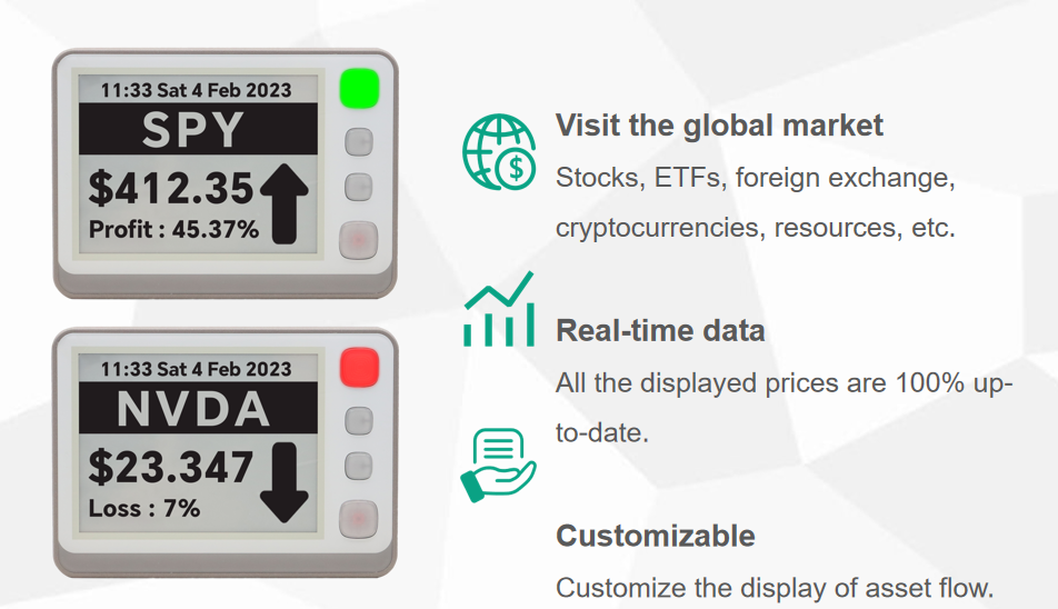Un dispositivo físico de visualización del mercado de valores para uso doméstico y de oficina, que utiliza una pantalla exclusiva E-INK para mostrar los precios más recientes de sus acciones, criptomonedas o posiciones de divisas actuales.