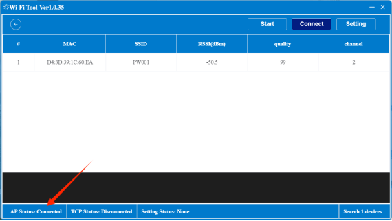 3. Cliquez sur Connecter l'appareil. État de la connexion AP dans le coin inférieur gauche : Connecté, indiquant que l'appareil est connecté.