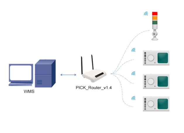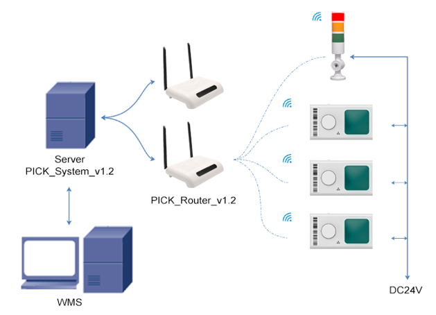 電子ラベルピッキングシステムは、PCまたはスキャニングガンから指示を送信し、ルーターを介して中継することで、電子ラベル上のLEDライトまたは画面を制御し、作業者が対応する商品を正確かつ迅速に指定された場所からピックアップできるように案内します。